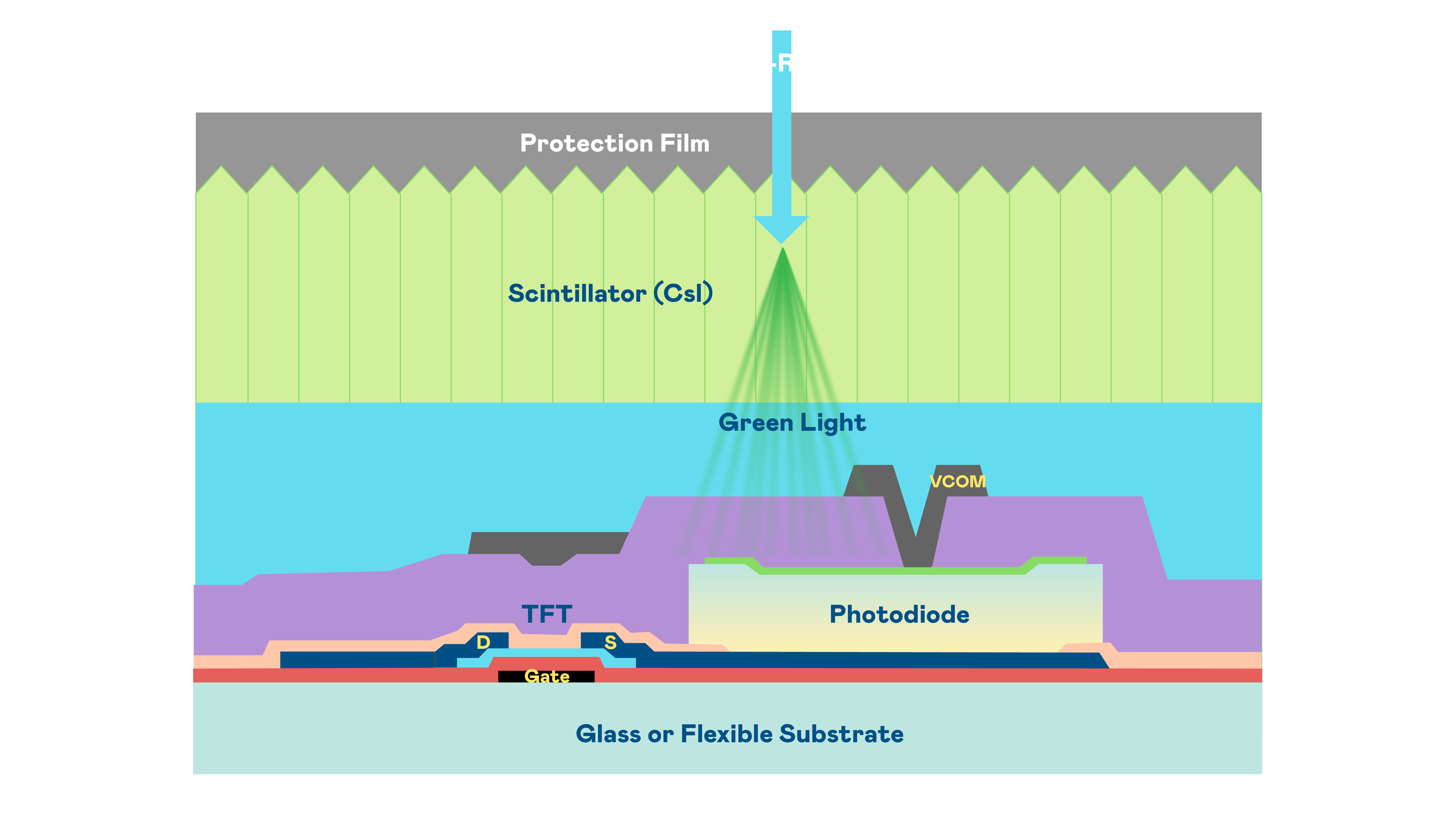 公海jcjc5500的X光影像感测阵列使用薄膜电晶体 (TFT) 作为每个像素的读取开关,搭配光电二极体(Photodiode)的光电转换元件,用以感测X光影像讯号。